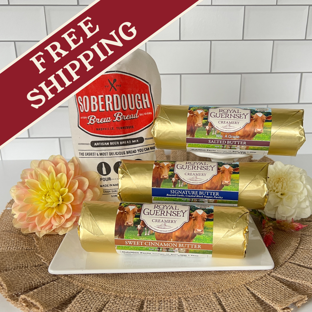 Experience the comfort of freshly baked bread and farm-fresh butter with our Royal Guernsey Butter & Bread gift set. This delightful pairing brings together our award-winning artisan butters and Soberdough’s easy-to-make craft bread mix, creating the perfect way to enjoy a warm slice slathered with rich, creamy butter.